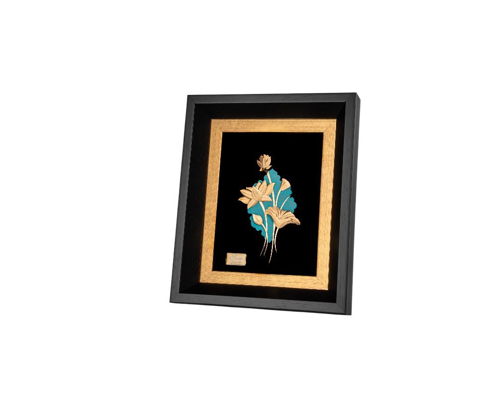 The background features rich lapis blue velvet, creating a modern yet elegant contrast with the golden flowers. The PVC frame with golden trim adds a classy touch, making this piece a perfect addition to any space