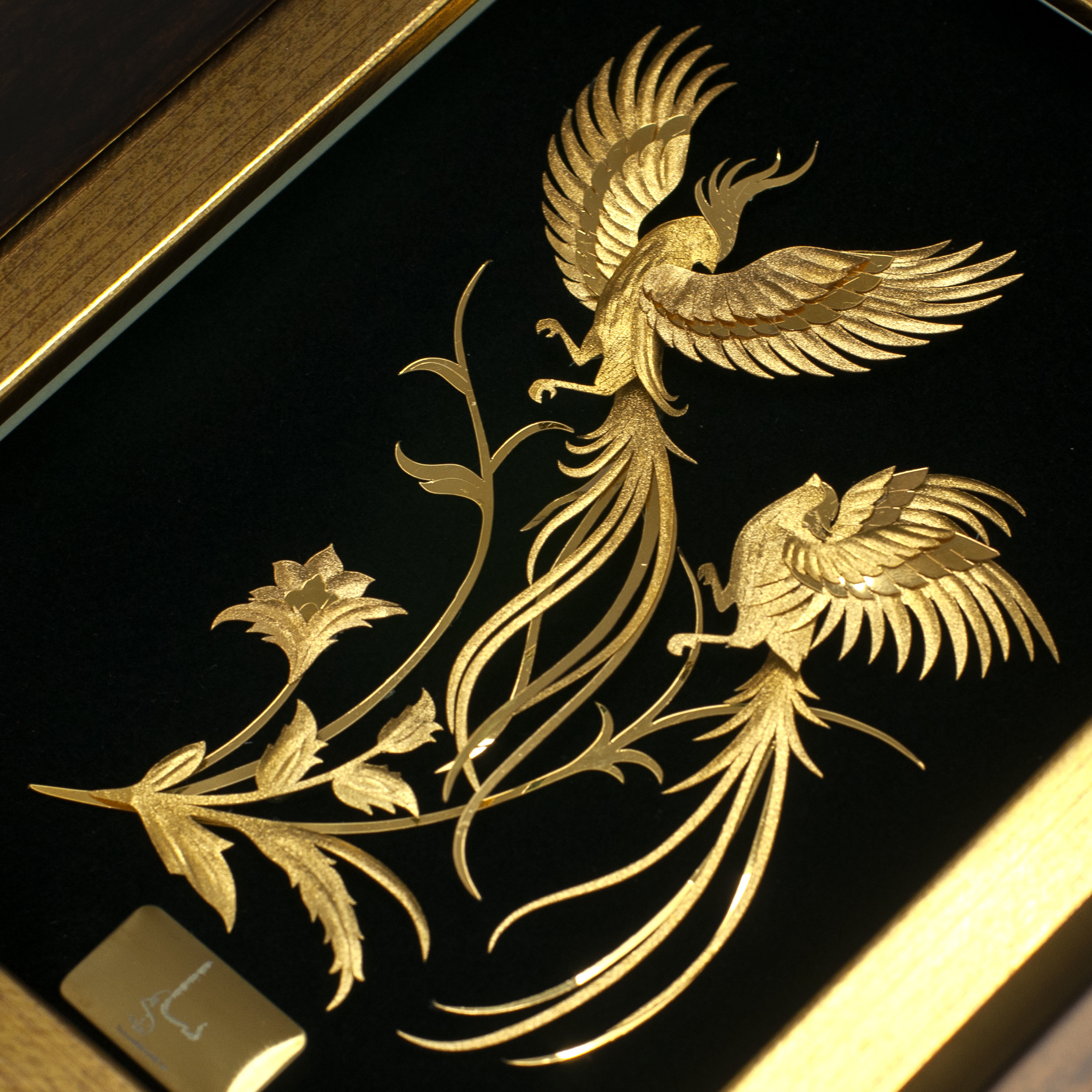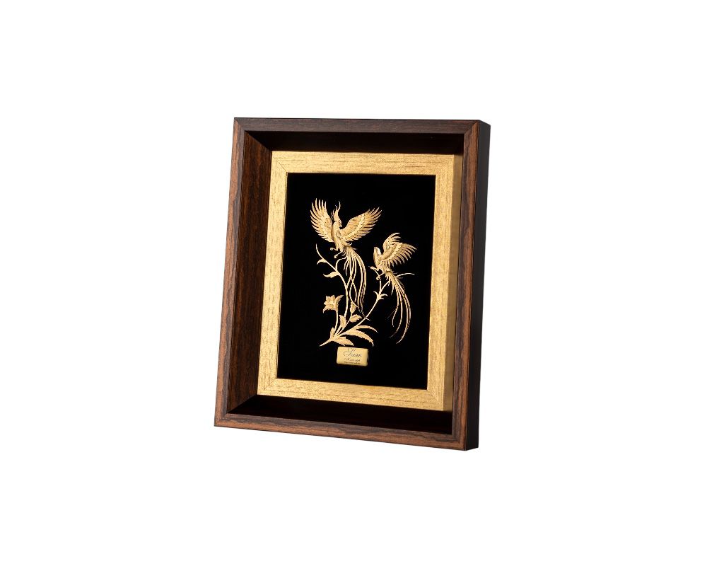 In this artwork, two golden birds soar in perfect harmony —